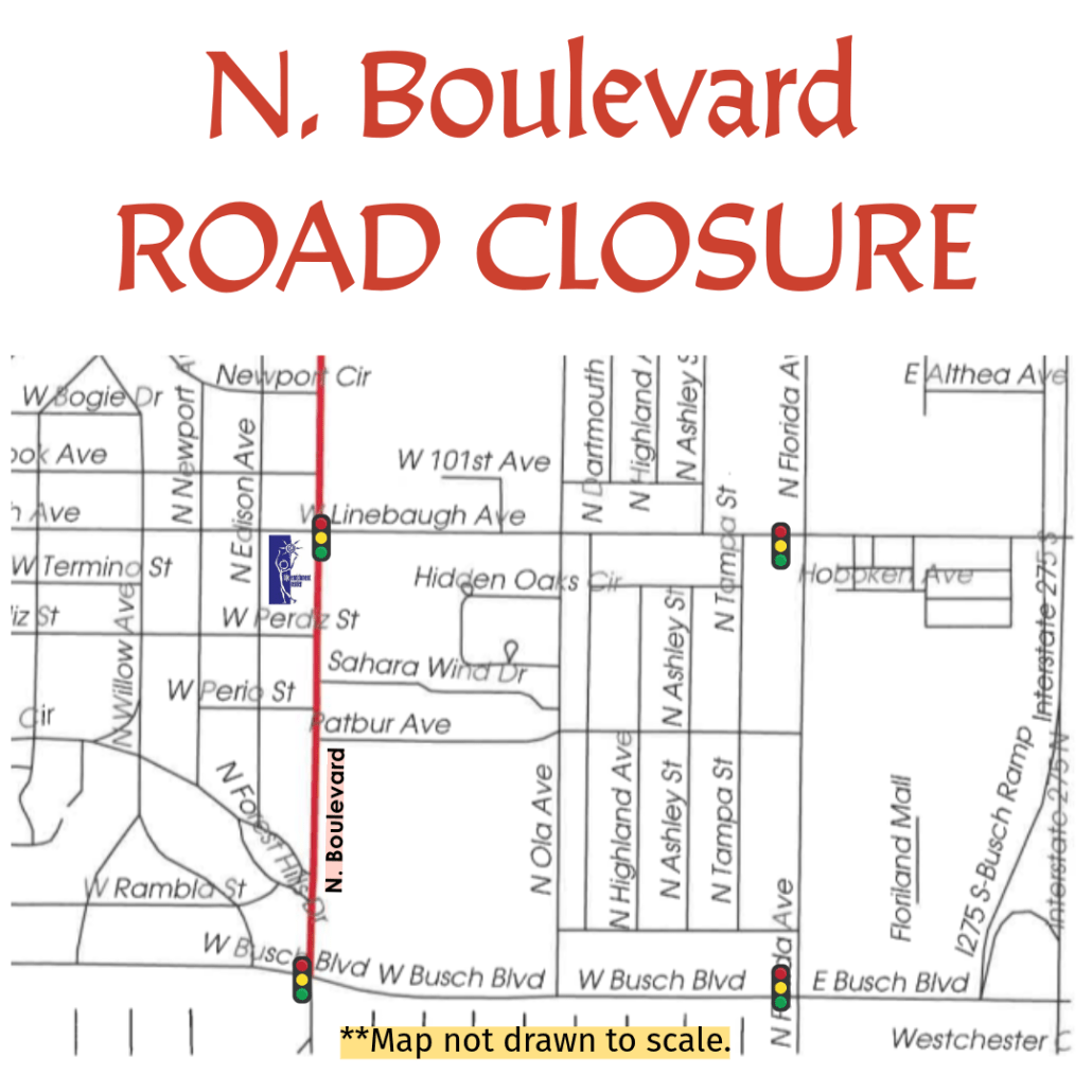The City of Tampa plans to resurface N. Boulevard from Country Club Dr. to Waters Ave. starting on Monday, April 21. Consequently, sections of N. Boulevard will be closed to traffic as they work.