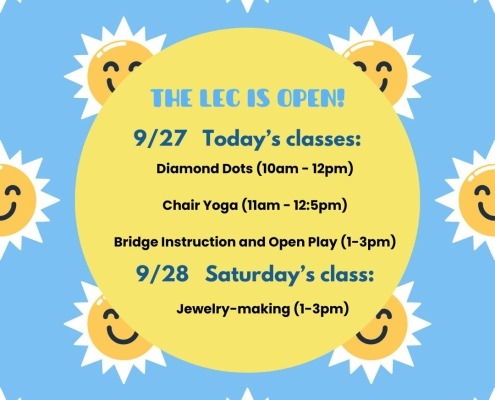 Hurricane Helene has passed, & the LEC is OPEN! Today's classes: Diamond Dots (10am-12pm), Chair Yoga (11am-12:25pm), & Bridge Instruction/Open Play (1-3pm) Tomorrow's classes: Jewelry-making (1-3pm) Join…